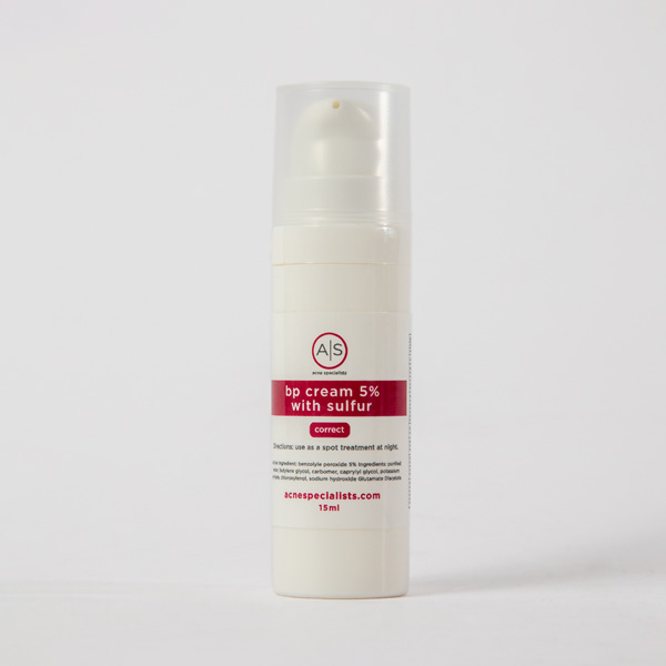 Our benzoyl peroxide cream at 5% strength with sulfur for an added boost. Use it as a spot treatment at night to reduce the appearance of inflammation. 15ml